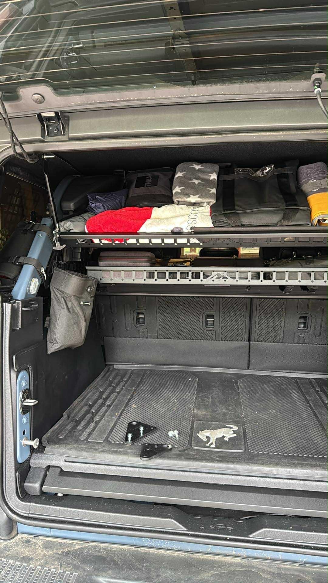 The BroncoNest uses two existing holes above the front passenger window, and either the factory rivnuts in the rear roll bar for 4 door models, or a high strength eye bolt above the rear speaker for 2 door models. No drilling or permanent mods needed.